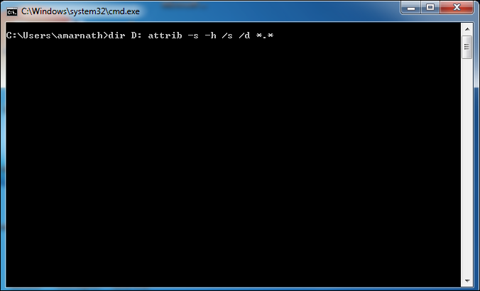 Step 2. Let the drive be D. So now type “dir D: attrib -s -h /s /d *.*” and press enter.