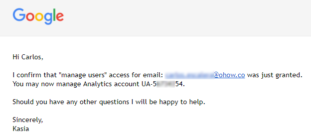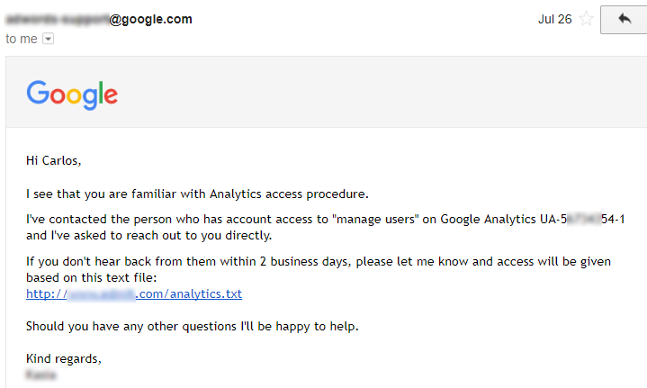 If after 2 business days there is no response from the current manager of the account, the Google employee will grant you the access based on the analytics.txt file you previously uploaded on the site.